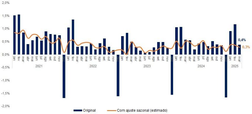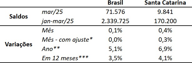 No mês de março de 2025 o mercado formal de trabalho em Santa Catarina apresentou um saldo positivo de 9,8 mil novas vagas, porém encerrando o trimestre com um resultado inferior aos dois meses anteriores, obtendo assim uma variação de 0,4%. Quando descontados os efeitos sazonais, essa variação cai para 0,3%. Nacionalmente, a variação foi de 0,1%, mas, após o ajuste sazonal, observa-se que não houve crescimento, obtendo uma variação nula.