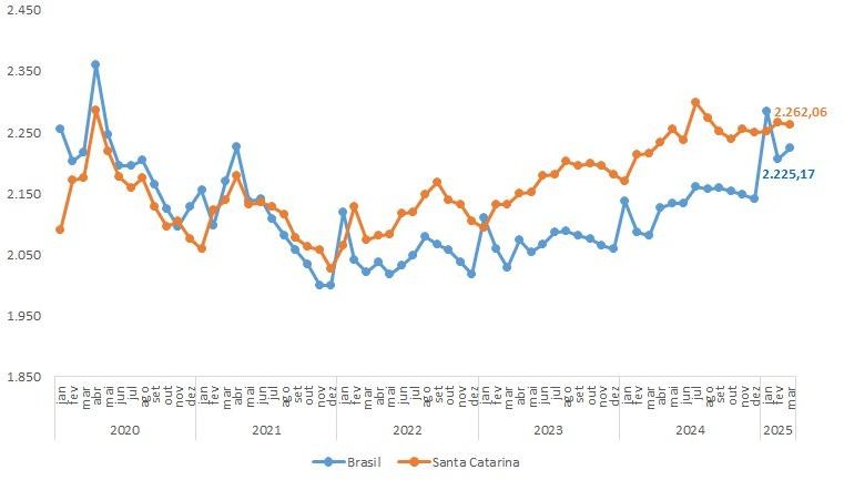Em fevereiro de 2025, o salário médio de admissão registrou uma retração de 0,2% em Santa Catarina e um aumento de 0,9% no Brasil, chegando às cifras de R$2.262,06 e R$2.225,17 respectivamente. No estado, observa-se que o salário médio reverte a tendência de crescimento registrado desde o início do ano. Já na esfera nacional, apesar da variação positiva registrada no mês em apreço, o resultado ainda permaneceu num patamar inferior ao catarinense, cujos componentes setoriais de contratações nos setores industrial e de serviços administrativos normalmente apresentam níveis salários acima da média.