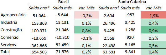 O setor de serviços impulsionou a geração de empregos formais no estado, especialmente na área da administração pública e nas atividades de publicidade. A indústria também colaborou com parte significativa nessas contratações, especialmente no abate de aves, que no mês contribuiu com um pouco mais de 40% dos produtos exportados pelo estado (SECINT/FIESC), e na fabricação de válvulas e registros. No recorte regional, destacam-se os empregos industriais em Joinville e no serviço de teleatendimento em Florianópolis.