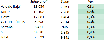 A região da Grande Florianópolis foi responsável pela geração de 2 mil postos formais, com um crescimento de 0,3%. Parte significativa das contratações se concentrou nas atividades de teleatendimento em Florianópolis, segmento que apresentou um crescimento expressivo quando avaliado na comparação interanual. O mesmo comportamento é observado nas atividades de limpeza em São José, com impactos importantes no resultado da região. Em função disso, no acumulado de 2025 a região contabilizou um saldo de 5,8 mil vínculos formais.