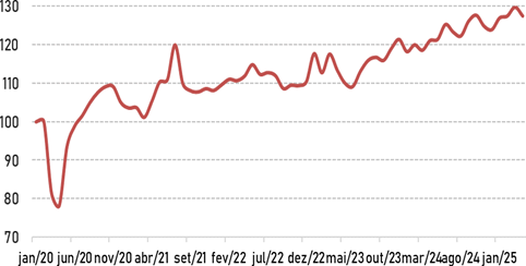 Ao longo de 2023 o setor demonstrou um desempenho mais sólido, embora a partir de julho o ritmo de expansão tenha se moderado, finalizando o ano com o índice superando o patamar anterior à crise sanitária. Já em 2024, o progresso, embora tenha perdido um pouco de ímpeto, manteve certa estabilidade, com o primeiro semestre sinalizando resiliência na demanda. No início de 2025, por sua vez, sobressai uma aceleração considerável nas vendas, que culminou em um novo pico histórico do indicador em março que logo se desfez nos meses seguintes (abril e maio) com o surgimento de uma nova inflexão, sugerindo uma possível acomodação após o vigoroso crescimento registrado nos meses precedentes.