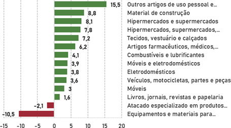 Entre os destaques positivos, o segmento de Outros artigos de uso pessoal e doméstico manteve a liderança, com o resultado de (15,5%), porém com baixa de 3,4 pontos percentuais em relação ao mês anterior. O segmento de Material de construção registrou desempenho expressivo, com variação de (8,8%). Já o setor de Hipermercados e supermercados registrou (8,1%), mantendo-se estável.