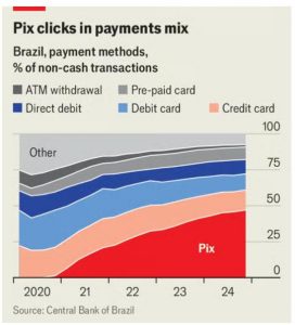 A maioria das pessoas provavelmente não vê o Brasil como líder em inovação financeira, mas sua economia política é bem diferente da norte-americana. Lá, ex- presidentes que tentam melar eleições vão para a cadeia. E os lobbies que travam uma moeda digital nos EUA têm menos força por lá. O Brasil planeja até uma CBDC, mas o primeiro passo foi o Pix, sistema de pagamentos do Banco Central lançado em 2020.
