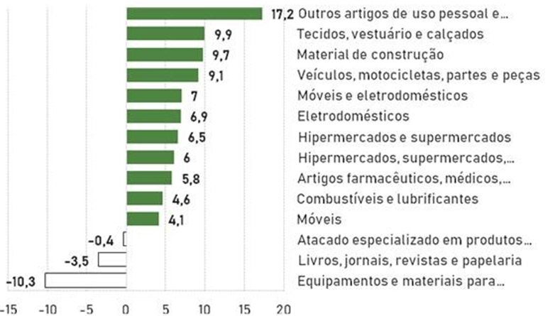Entre os destaques positivos, o segmento Outros artigos de uso pessoal e doméstico (17,2%) se manteve em primeiro. O segmento de Tecidos, vestuário e calçados (9,9%) também obteve um desempenho positivo, porém abaixo do mês passado. Já Veículos, motocicletas, partes e peças (9,1%) também manteve trajetória ascendente, superando 0,4 pontos acima do mês passado e acompanhando o bom desempenho da indústria de transformação, em especial da fabricação de automóveis.