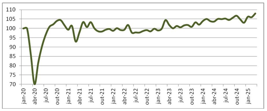 Gráfico 1 – Índice de volume de vendas do comércio varejista ampliado com ajuste sazonal, Brasil, 2020-mar 2025 (jan 2020 = 100)